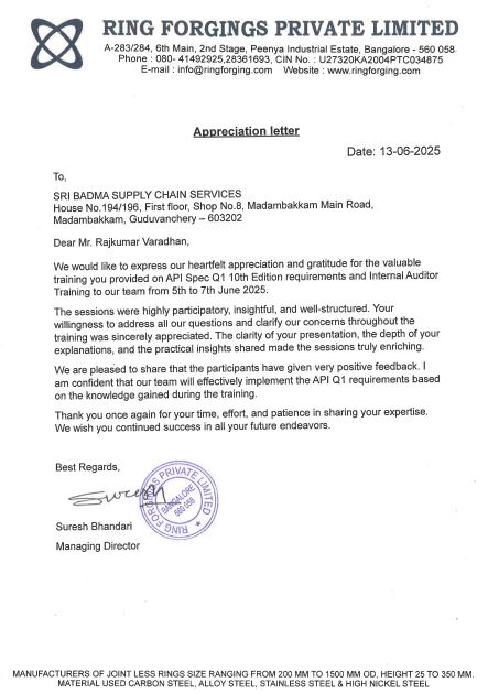 Gallery Training - API Spec Q1 10th edition and Internal Auditor - Ring Forgings, Bangalore - Jun 2025